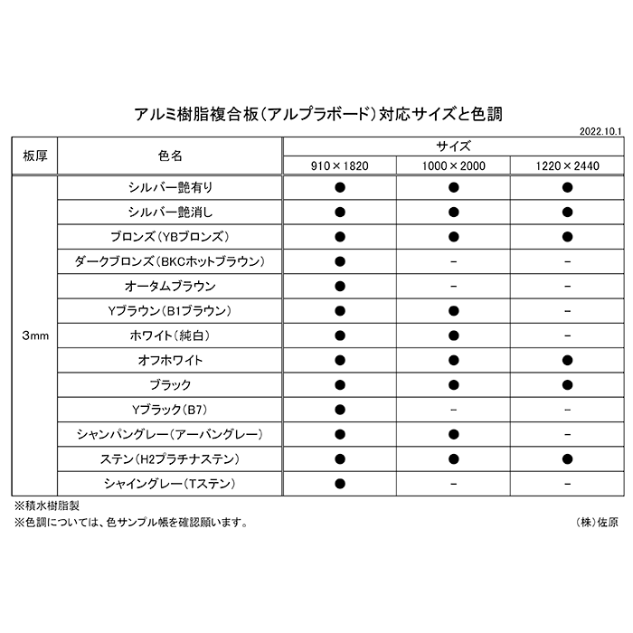 910×1820(全色) 1000×2000(B1・ホワイト・シャンパングレー) 1220×2440(シルバー艶有り・シルバー艶消し・ブロンズ・オフホワイト・ブラック・ステン) ※詳しくは対応表をご覧ください。 |